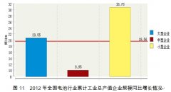 據中國輕工業預測預警系統顯示:2012年大型電池企業完成工業總產值占比為40.62%,同比增長20.55%;中型電池企業完成工業總產值占比31.25%,同比增長9.95%;小型電池企業完成工業總產值占比28.13%,同比增長30.7%。小型企業產值增長快于大中型企業。...