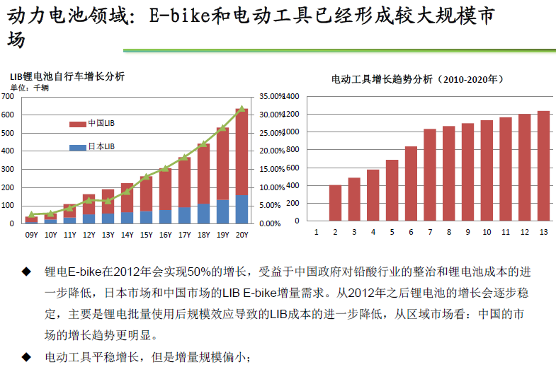 鋰電E-bike在2012年會實現(xiàn)50%的增長,受益于中國政府對鉛酸行業(yè)的整治和鋰電池成本的進一步降低,日本市場和中國市場的LIB E-bike增量需求。從2012年之后鋰電池的增長會逐步穩(wěn)定,主要是鋰電批量使用后規(guī)模效應(yīng)導(dǎo)致的LIB成本的進一步降低,從區(qū)域市場看:中國的市場的增長趨勢更明顯。 電動工具平穩(wěn)增...
