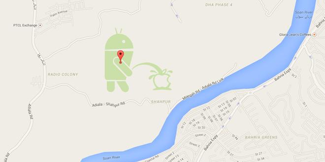 有點惡搞:谷歌地圖上出現安卓機器人朝蘋果Logo小便