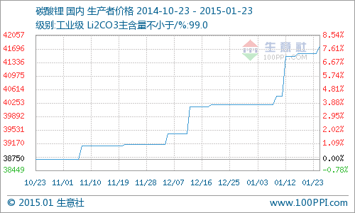 碳酸鋰價格自2015年1月上旬上調500元/噸后,河南、四川、江西等地多家企業1月23日再次上調報價,工業級碳酸鋰價格上調300-2000元/噸,電池級碳酸鋰亦漲1000元/噸報46000元/噸。...