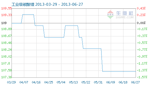6月13日工業級碳酸鋰商品指數為107.55,與昨日持平,較周期內最高點112.10點(2012-11-04)下降了4.06%,較2012年01月05日最低點98.94點上漲了8.70%。(注:周期指2011-09-01至今) 工業級碳酸鋰商品指數...