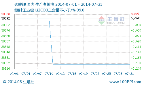 7月國內工業(yè)級碳酸鋰行情僅在中上旬小幅下行,月初價為月高價38893元/噸,月末價為月低價38821元/噸,月跌幅為0.18%,當前價格同比去年下降了6.93%。...