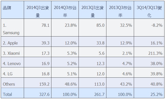 全球智能手機出貨量超3億部 小米躍居第三
