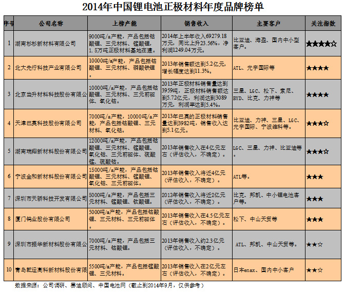榜單根據我國正極材料企業的產能數據、客戶分布、公司情況、誠信形象等得出,數據來源為公司調研和機構數據(數據統計截止到2014年9月,僅供參考)。...