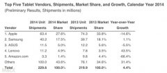 去年第四季度iPad 銷售放緩,而全球平板電腦市場也經(jīng)歷了自2010年依賴第一次同比銷量下滑。去年第四季度,蘋果iPad 出貨量為2140 萬,市場份額為28.1%。三星的出貨量為1100萬,市場份額為14.5%。...